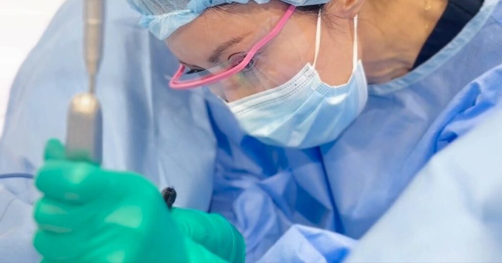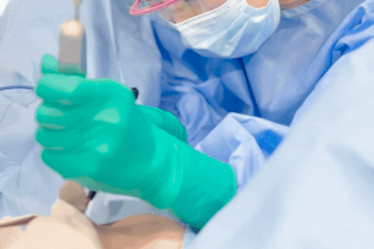 麻酔専門医または経験豊富な医師の管理下で麻酔を行います。直視下法により、止血を徹底しながら古い組織の処理とバッグ挿入を行います。