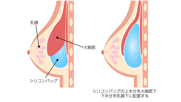 皮膚が薄い方や痩せ型の方に推奨される手法です。シリコンバッグの上半分を大胸筋の下に、下半分を乳腺の下に配置することで、バッグの縁が浮き出るのを防ぎ、デコルテから自然なラインを形成します。触り心地もより自然になります。