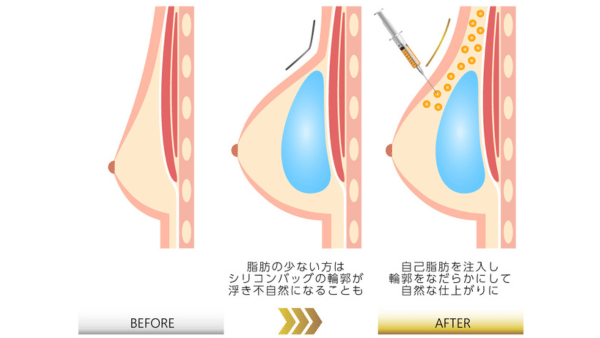 シリコンバッグ挿入と同時に、ご自身の脂肪をバッグの周囲やデコルテに注入する方法です。バッグで確実にサイズアップしつつ、脂肪で柔らかさと自然な谷間を演出します。特に修正手術の場合、皮下組織が薄くなっていることが多いため、脂肪注入の併用は仕上がりを格段に良くします。