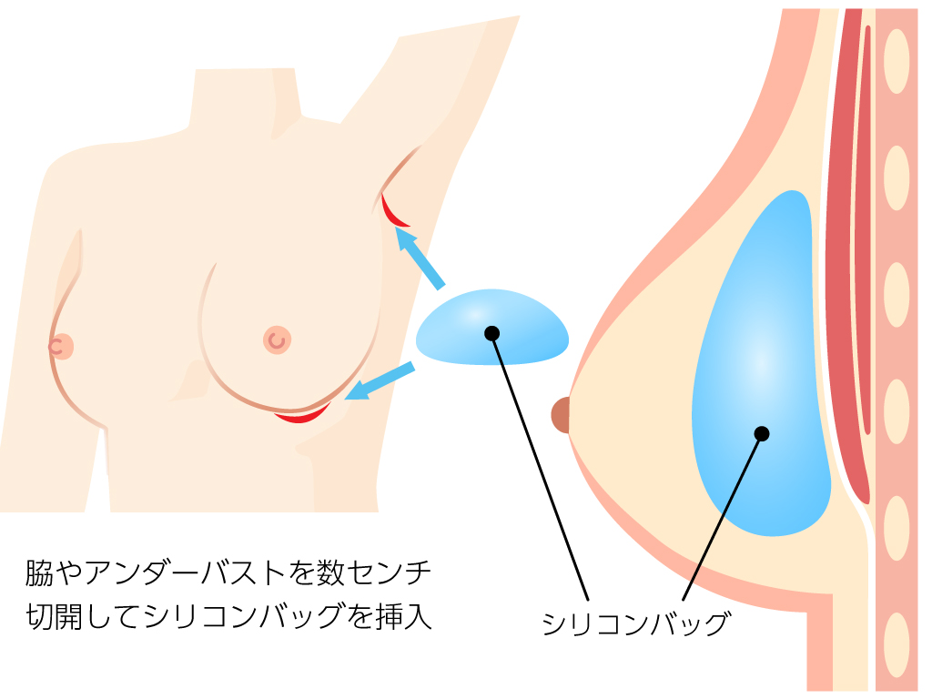 脇の下や乳房下溝から数センチの切開を行い、乳腺下や大胸筋下などの適切な層にシリコンプロテーゼを配置することで、理想のバストサイズと形を実現します。